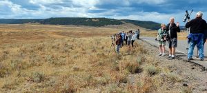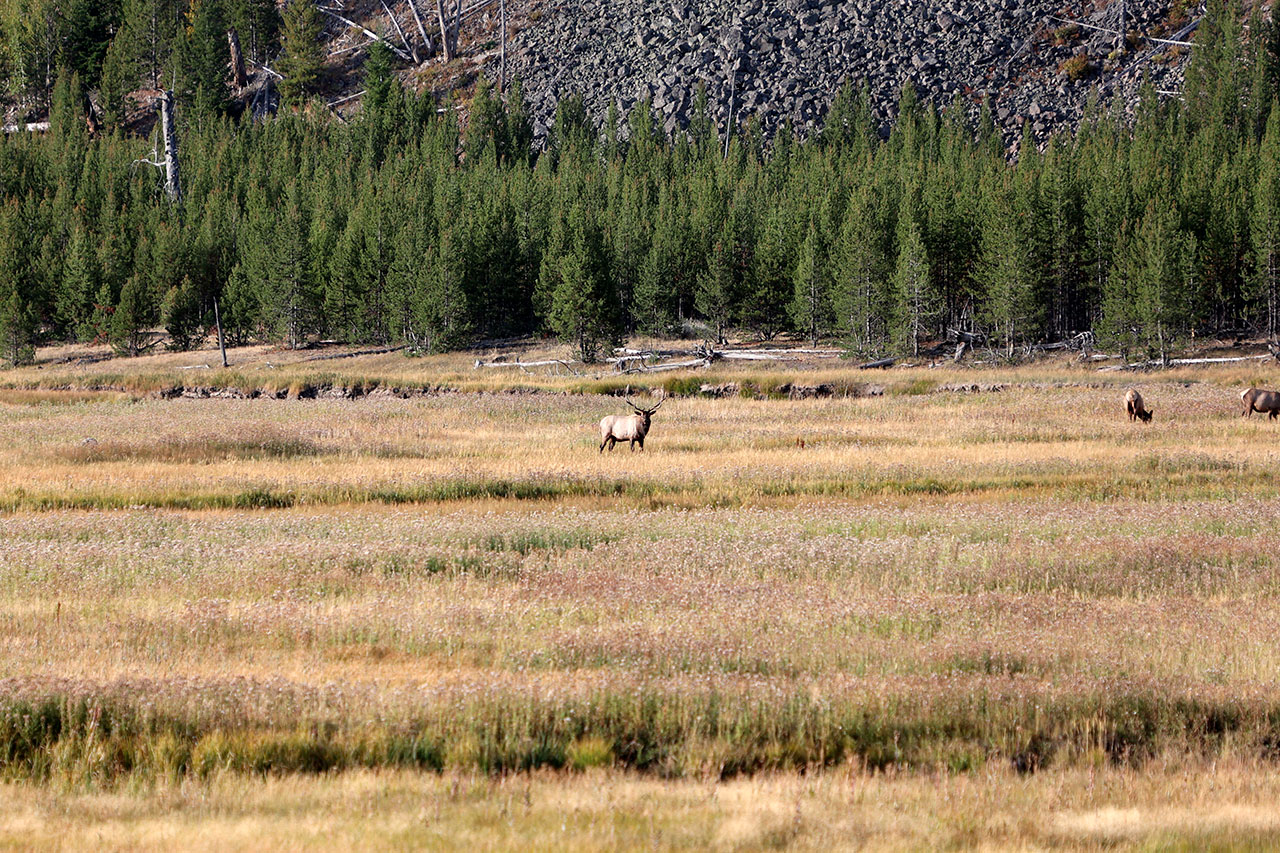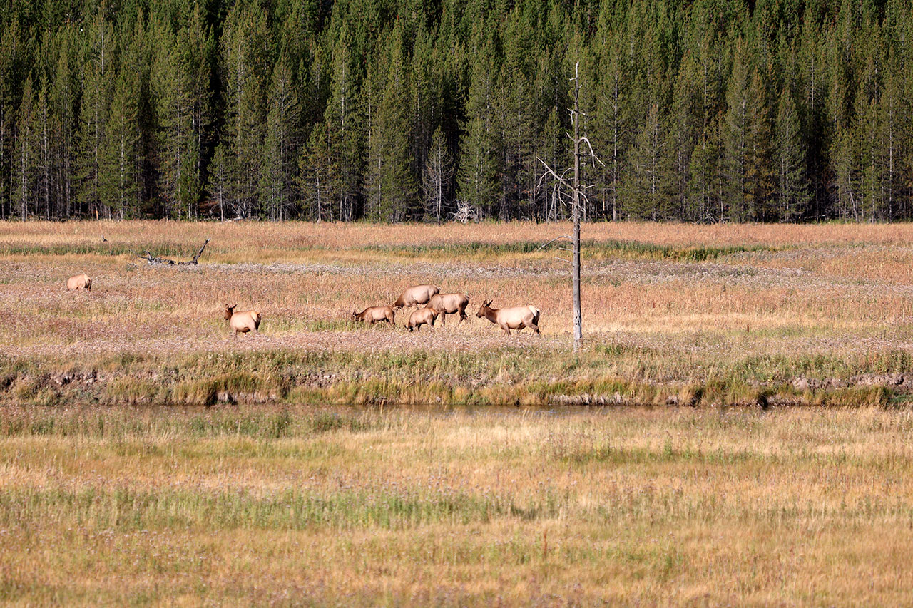 Heureusement, quelques kilomètres plus loin elle trouvera à stopper. Non pas pour des loutres mais pour un troupeau de wapitis en train de faire sa vie dans la prairie. Alors que je fais des photos, une dame avec un téléobjectif d’un fort beau gabarit s’approche et me dit « à droite il y a 2 femelles qui se chicanent et le mâle est à gauche là-bas ». Whow merci madame. Ce sera constant durant la journée, tout le monde partage les infos sur ce qu’on regarde et surtout où regarder car parfois, ce n’est pas évident.