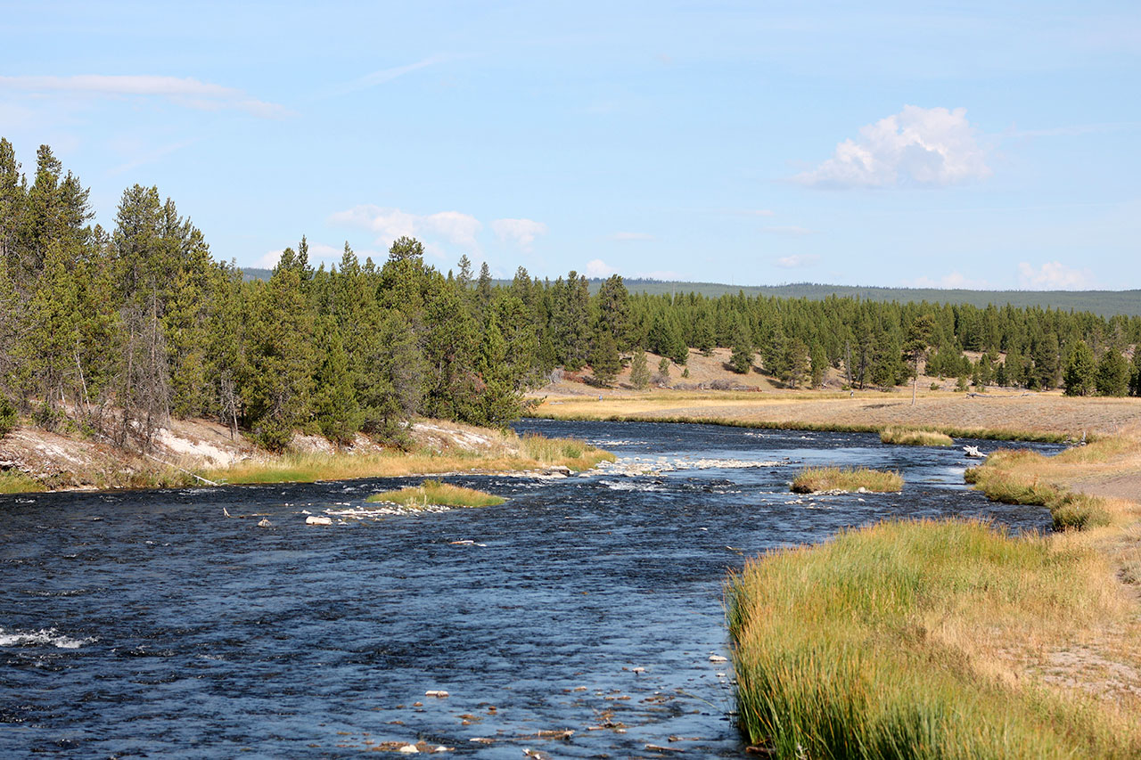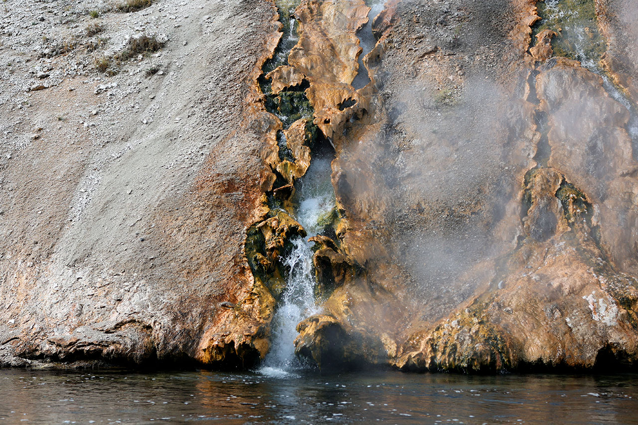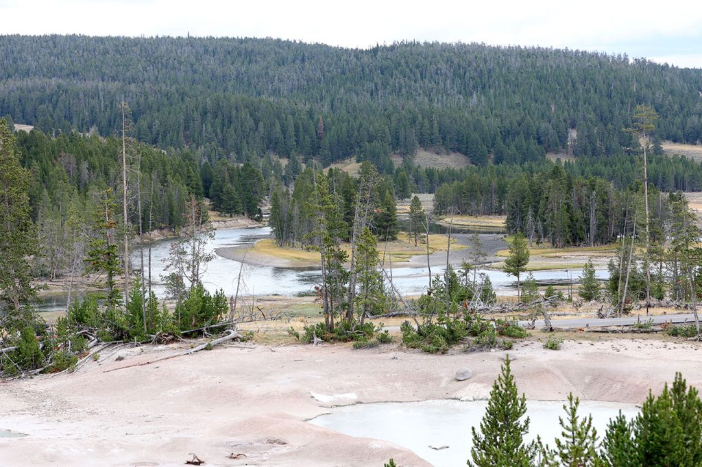 Nous longeons le lac un bon moment avant d’arriver à une immense plaine. Nous stoppons pour voir d’autres sources chaudes dont une qui a enfin l’odeur d’oeuf pourri tant attendu. Encore une fois c’est très chouette, en contre bas de l’autre côté de la route coule la rivière Yellowstone. C’est en partie ici qu’on trouve ce paysage typique de cette partie des USA avec la rivière, la plaine, la forêt en second plan et les montagnes en fond. Ajoutez aussi quelques pêcheurs à la mouche dans la rivière.