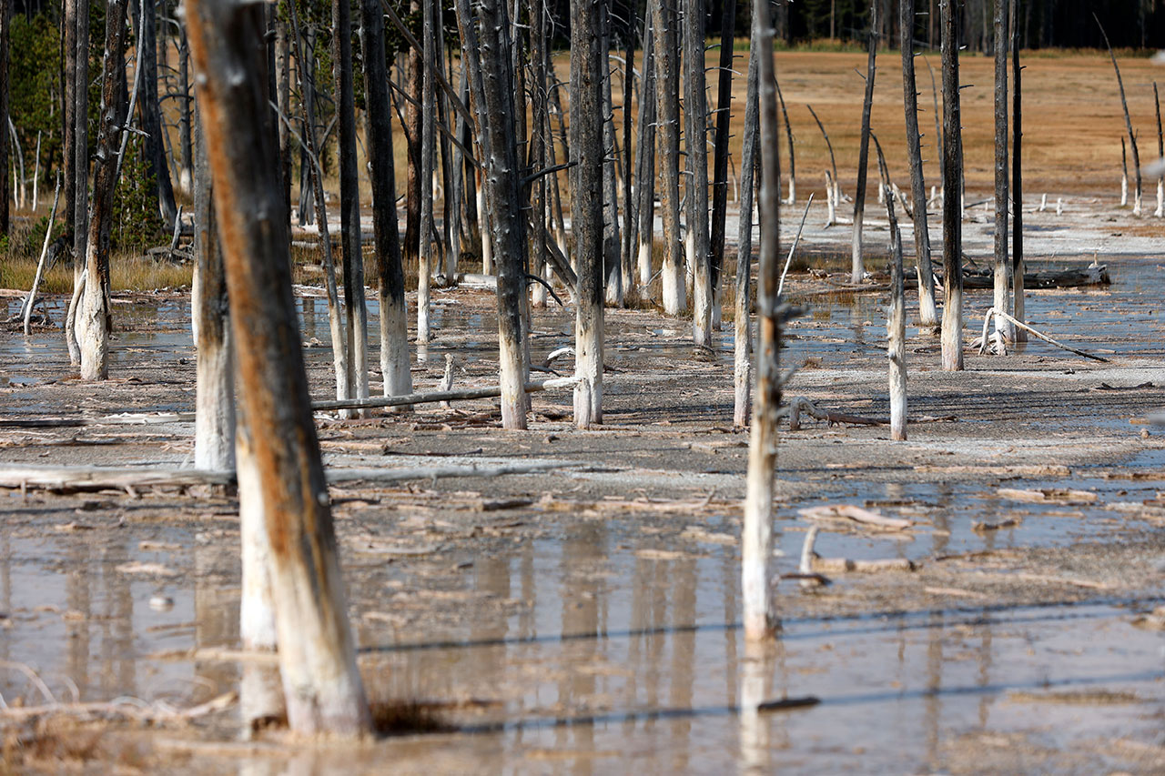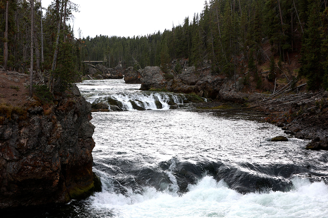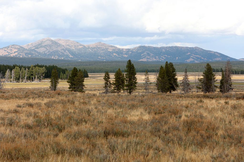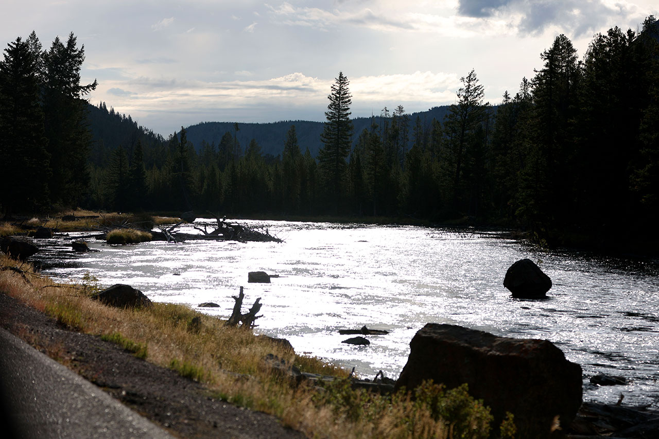 Nous longeons le lac un bon moment avant d’arriver à une immense plaine. Nous stoppons pour voir d’autres sources chaudes dont une qui a enfin l’odeur d’oeuf pourri tant attendu. Encore une fois c’est très chouette, en contre bas de l’autre côté de la route coule la rivière Yellowstone. C’est en partie ici qu’on trouve ce paysage typique de cette partie des USA avec la rivière, la plaine, la forêt en second plan et les montagnes en fond. Ajoutez aussi quelques pêcheurs à la mouche dans la rivière.