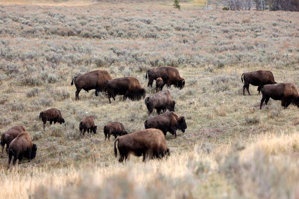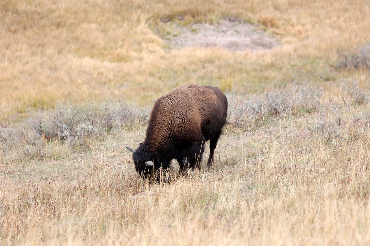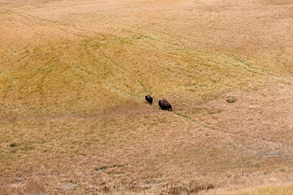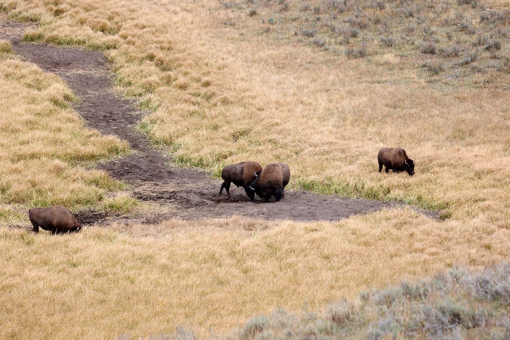 Nous repartons et quelques kilomètres plus loin c’est le début de la foire à la saucisse. Des voitures arrêtées partout – alors qu’il y a des panneaux disant que c’est strictement interdit – et en contre bas dans le virage, un troupeau de bison d’une cinquantaine d’individus. Impossible de se garer proprement. Aurélie avance et trouve finalement une place environ 700 mètres plus loin. Nous reviendrons donc sur nos pas à pied. Les rangers demandent de ne pas s’approcher à moins de 50 mètres des bisons. Comme ces derniers bougent, on se retrouve parfois à moins que ça malgré nous. Bah j’aime autant vous dire qu’un bison de 800kg, même à 20 mètres de distance ça en impose. A 200 mètres sur ma droite, les bisons ont commencé à remonter en direction de la route et donc des voitures. Les gens au lieu de remonter dans leurs voitures et se tirer de là sont restés à filmer. Les animaux étant à moins de 10 mètres d’eux. J’ai pas les mots pour tant d’inconscience.