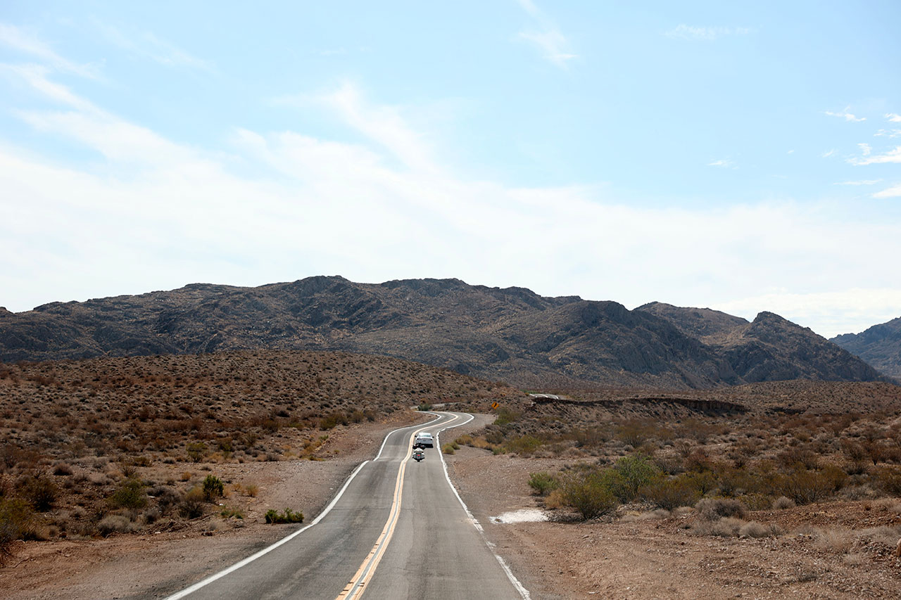 Ce matin, départ de Las Vegas. Je laisse sans aucun regret les routes grasses de la ville qui rendent l’adhérence douteuse. Il fait beau, pas trop chaud (26° à 8h30) et le trafic est OK. Nous décidons de repasser une dernière fois par le Strip histoire de marquer le coup. Ce qui nous permet de voir de les choses sous un jour nouveau – c’est le cas de le dire. Pour le coup, c’est presque plus sympa de jour.