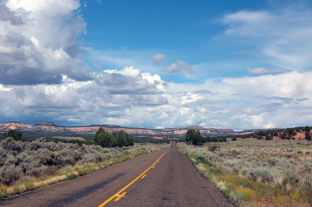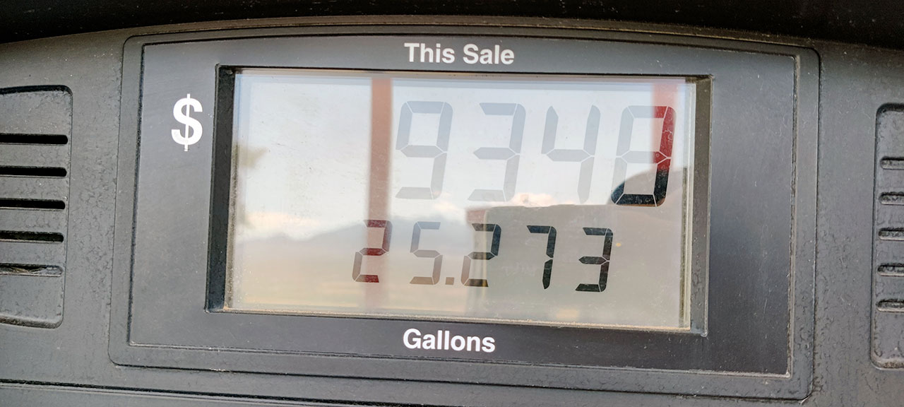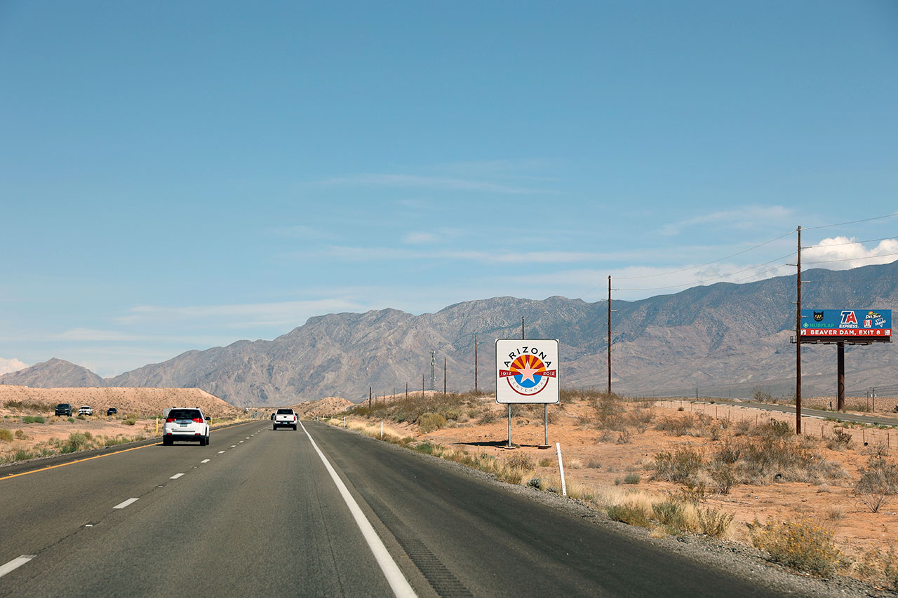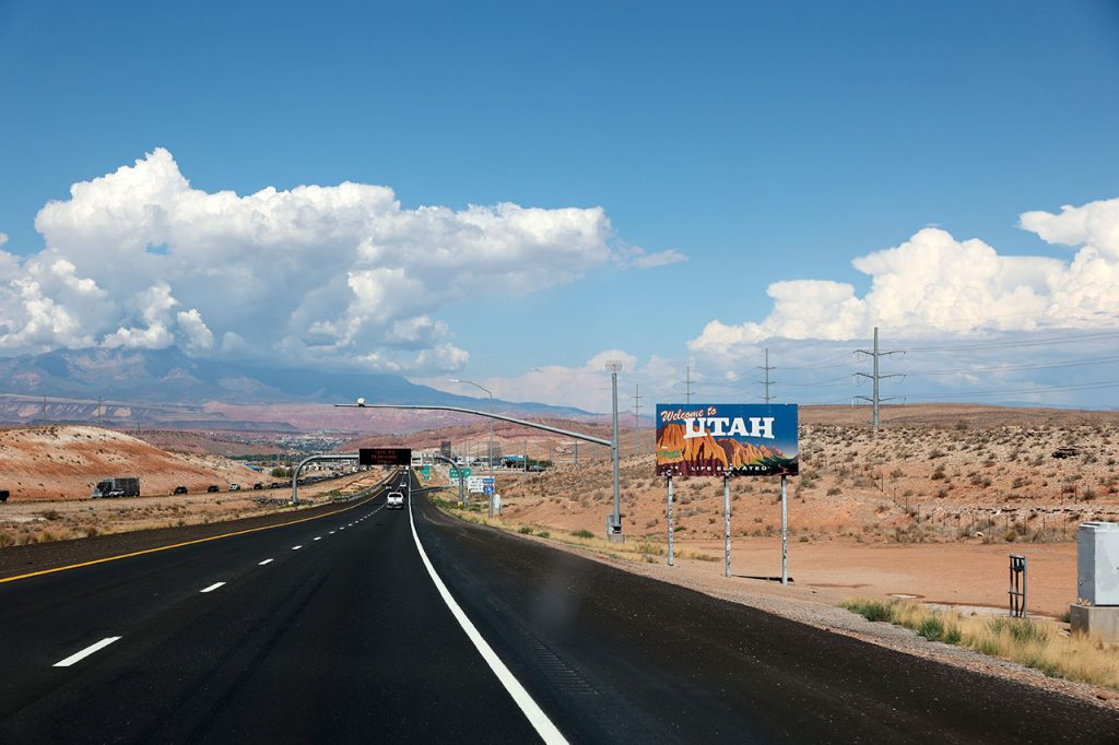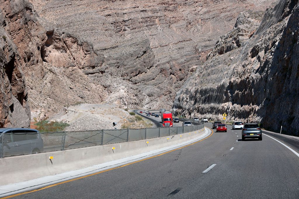 Aurélie reprend le volant sur les routes endommagées, avant de rejoindre de nouveau l’I15. Nous traverserons successivement les frontières de l’Arizona puis de l’Utah avant une pause déjeuner dans un relais routier qui sera le théâtre du premier plein d’essence.