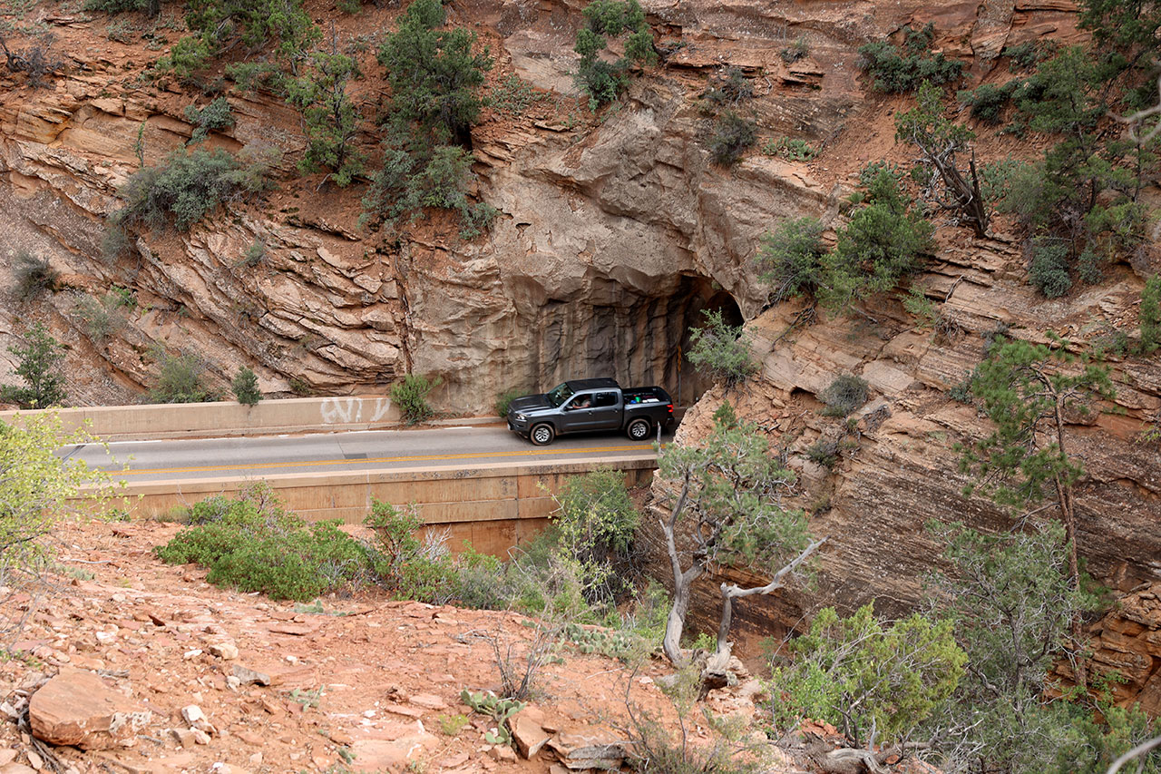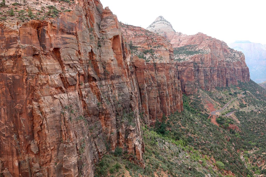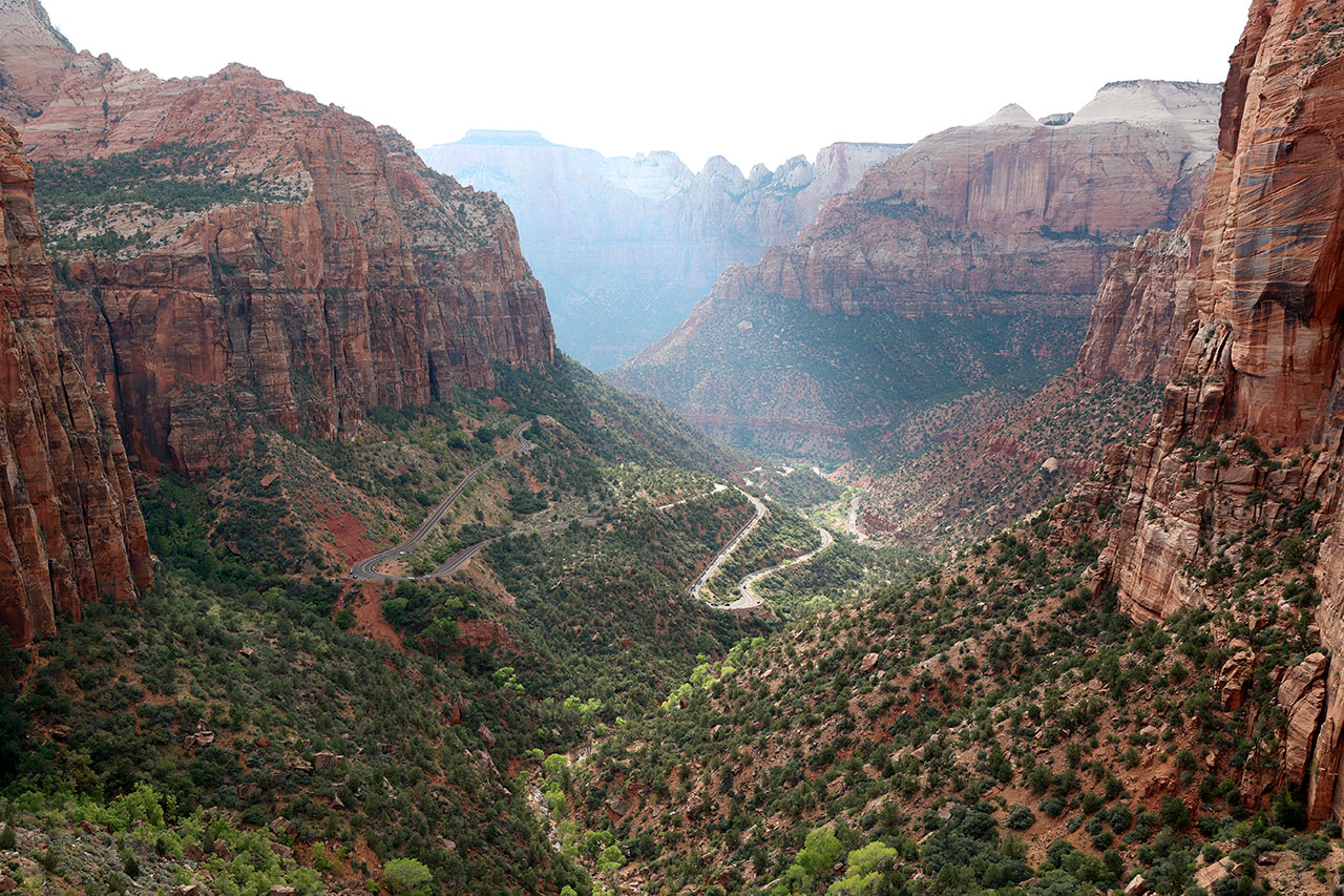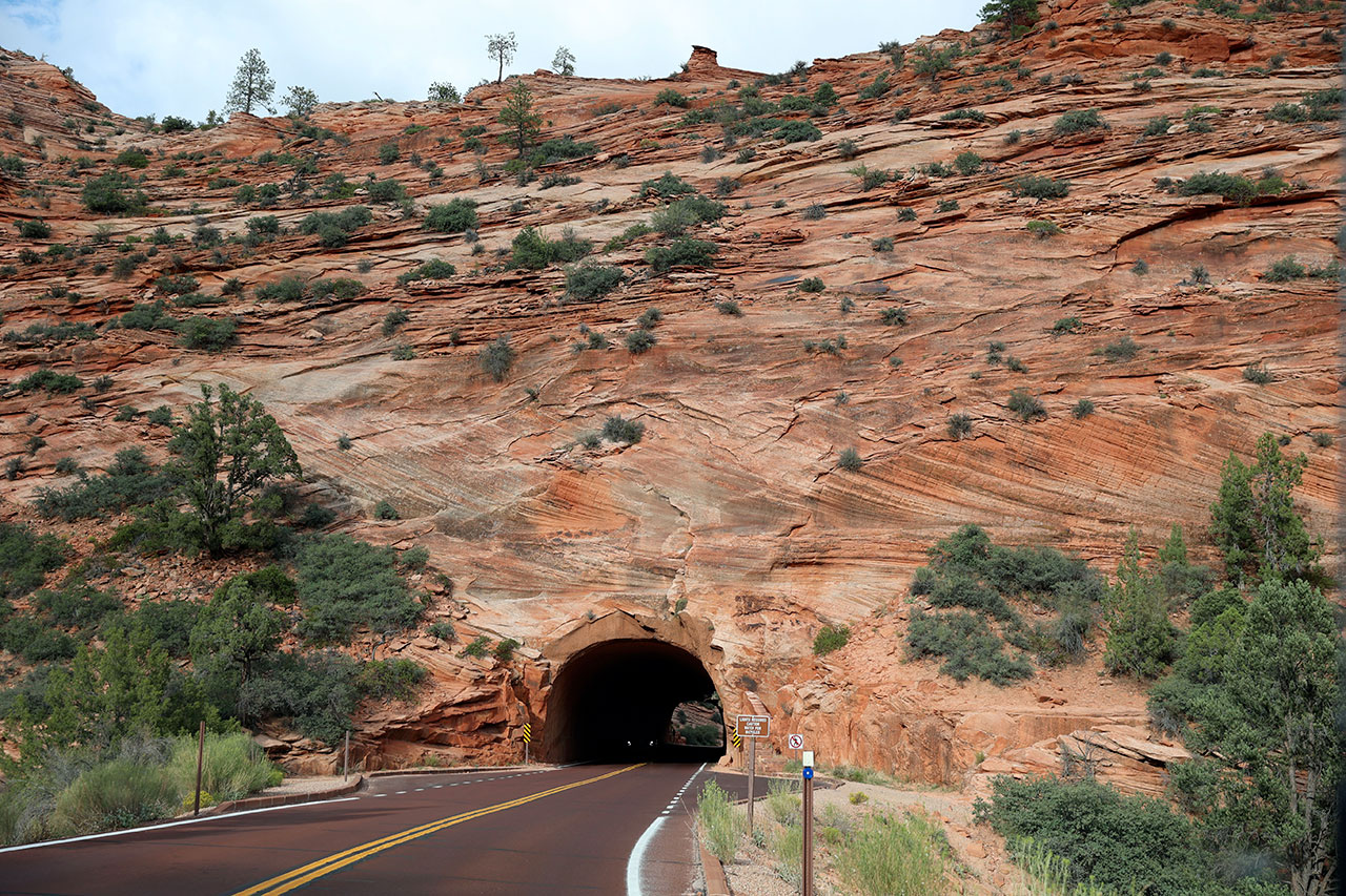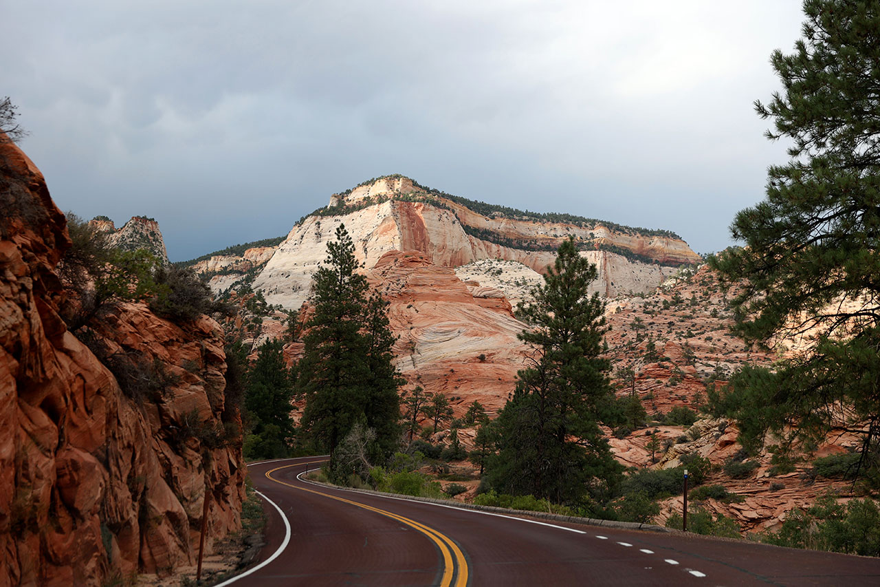 Vous me connaissez, je suis patient et d’un calme olympien. Non en vrai j’ai failli balancer mon téléphone par la fenêtre. Donc le premier parc tronqué et maintenant le second évité? Ha mais non! Il est déjà 16h, il y a encore de la route à faire jusqu’à l’hôtel mais hors de question de ne pas aller voir Zion. Donc au lieu de traverser le parc comme prévu, nous ferons un aller retour dedans. Ca va nous faire arriver un peu tard, d’autant que nous avons avancé dans le temps d’une heure (l’Utah est dans un fuseau horaire différent du Nevada) et pour couronner le tout, le ciel est très très menaçant. Mais faut ce qu’il faut. Et vous savez quoi? Aucun regret.
