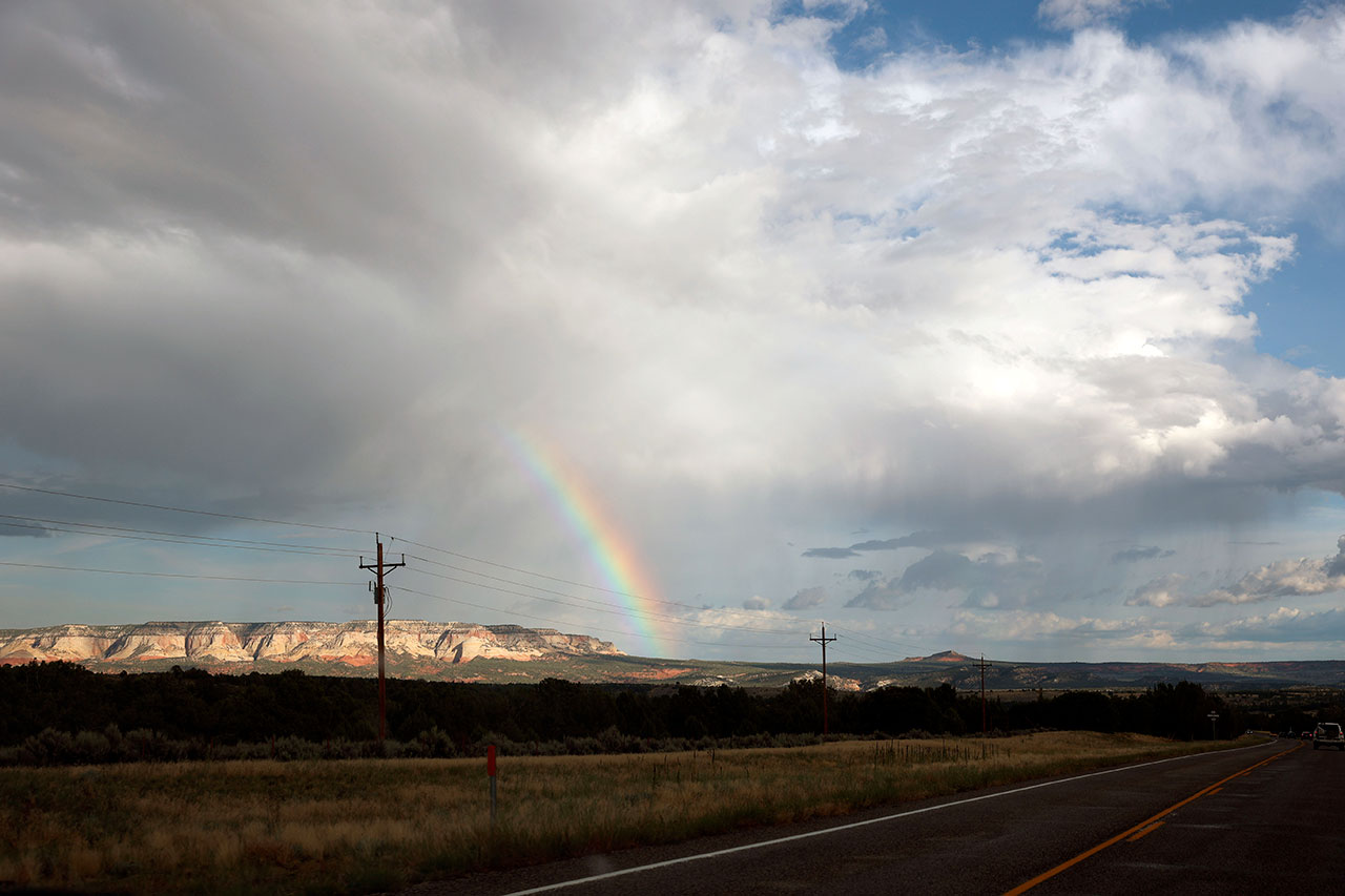 Je reprends le volant après déjeuner. Tout se passe tranquillement en direction de Zion National Park jusqu’à ce que Google Maps nous dise « hey j’ai trouvé un trajet plus court ». Ici nous utilisons Google Maps car plus efficace que Waze comme GPS, du moins nous le pensions. Je fais donc confiance à la technologie. Pendant plus d’une heure trente, il nous fera passer par moult petites routes, certes sympathiques mais un peu pénible au bout d’un moment. Puis de retour sur une grosse artère après un court passage en hors piste, je vois un panneau qui me fait comprendre que Google Maps a purement et simplement fait contourner le parc de Zion.