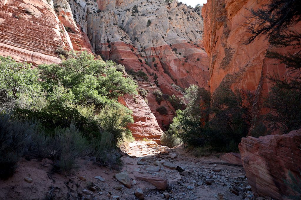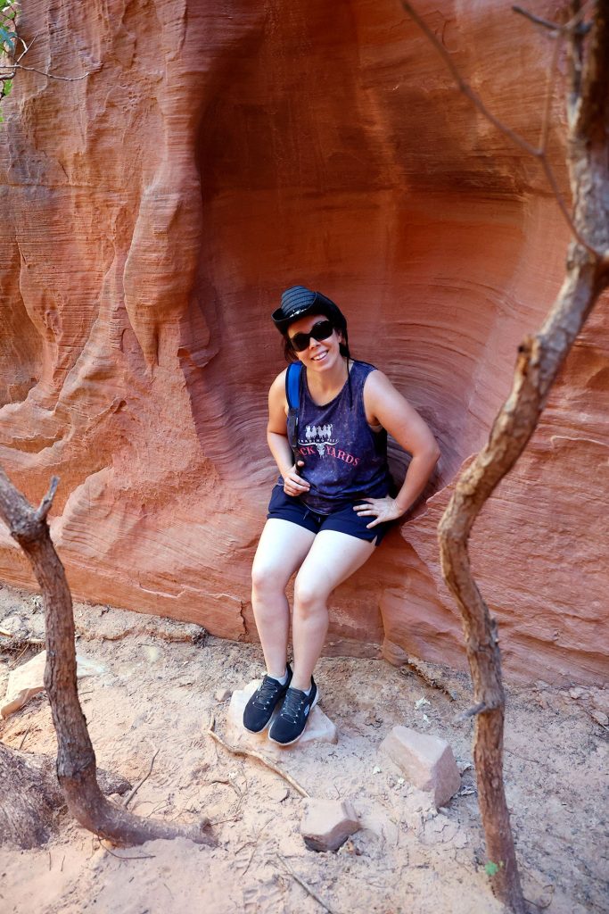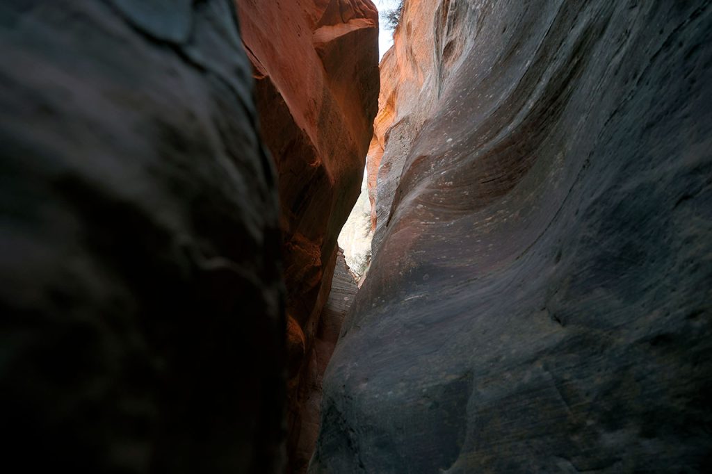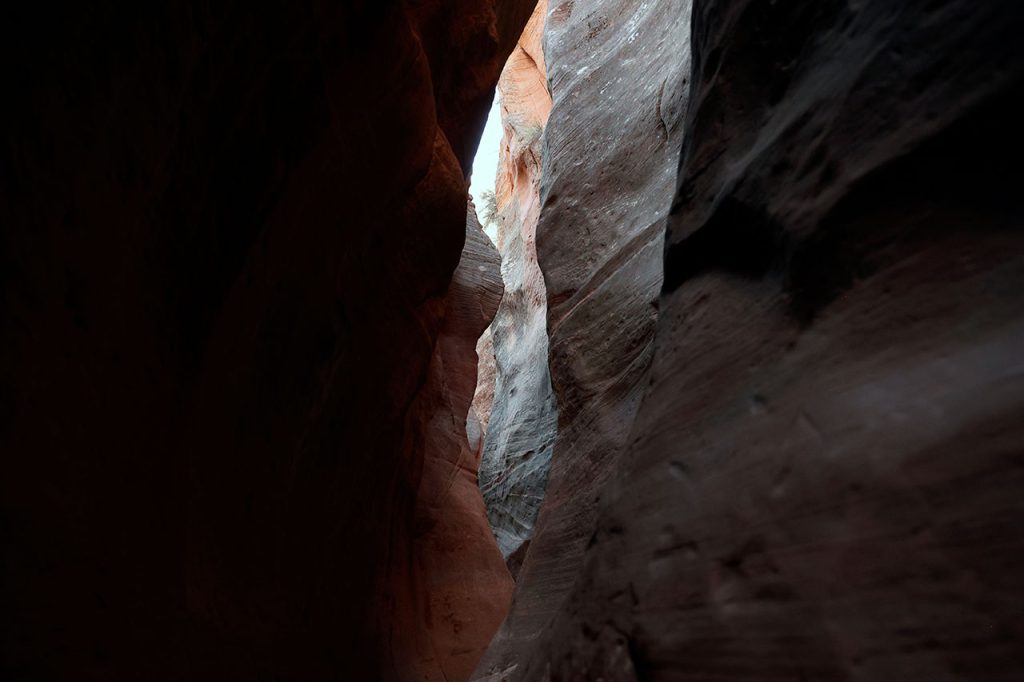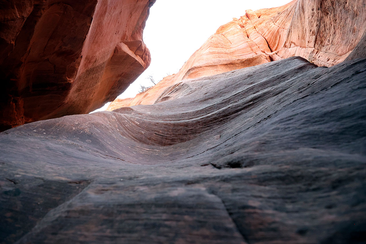 Nous premier arrêt du jour se fera à Orderville. Ou plutôt sur les hauteurs d’Orderville. L’endroit se trouve à une petite heure de voiture de Tropic, c’est un bled du bout du monde comme il y en a des milliers aux Etats-Unis. Alors qu’y a t-il de rare à Orderville? Un slot canyon – littéralement un canyon en fente. Le sud de l’Utah regorge de ce type de canyons. Le problème était que les plus spectaculaires sont soit accessibles uniquement avec un véhicule 4 roues motrices (ce qui n’est pas le cas de notre tank), soit ils n’étaient pas sur notre route. Le plus célèbre et le plus beau est Antelope Canyon mais celui-là est payant et absolument hors de prix. Entre 150 et 300$ / personne suivant la compagnie qui vous y amène. Car l’endroit étant une réserve des indiens Navajo, ce sont eux qui fixent les prix. Donc comme je voulais vraiment en voir un slot canyon, il a fallu transiger. Encore une fois, merci Instagram pour cette trouvaille.