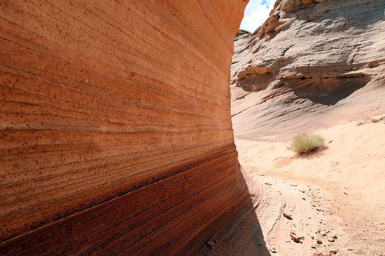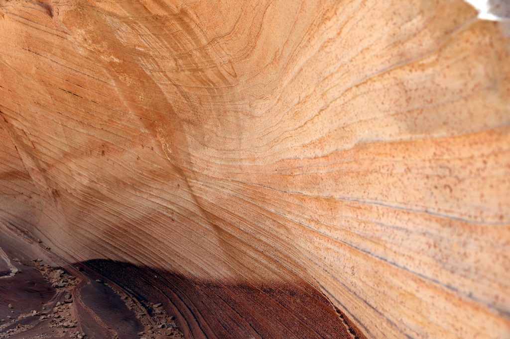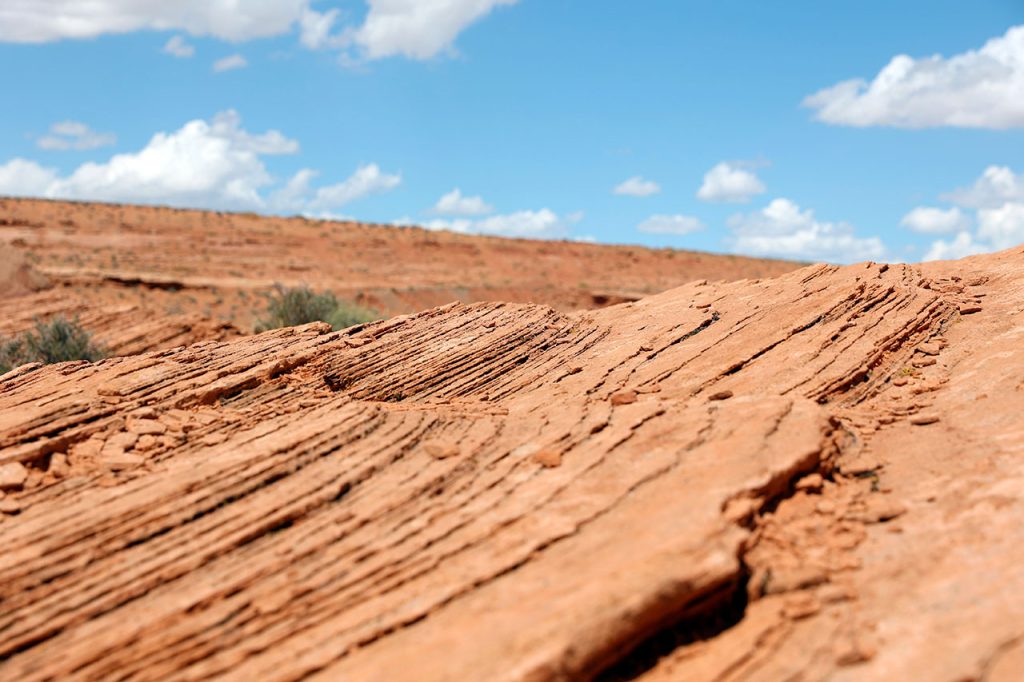 Le second arrêt du jour est un endroit nommé The New Wave quelques kilomètres avant Page. Si l’endroit se nomme The New Wave (la nouvelle vague) c’est qu’il existe un endroit nommé The Wave. Il porte ce nom car le roche est marquée par l’érosion qui y a tracé des sorte de « vagues ». C’est absolument sublime. Le hic est que l’accès à cet endroit est extrêmement réglementé. Seulement 64 personnes sont autorisées à y accéder chaque jour et pour avoir un ticket, il faut s’inscrire à une loterie 3 mois avant la date de visite espérée. Sans parler du prix du permis si on gagne la loterie. Donc pour faire simple et gratuit, direction The New Wave.