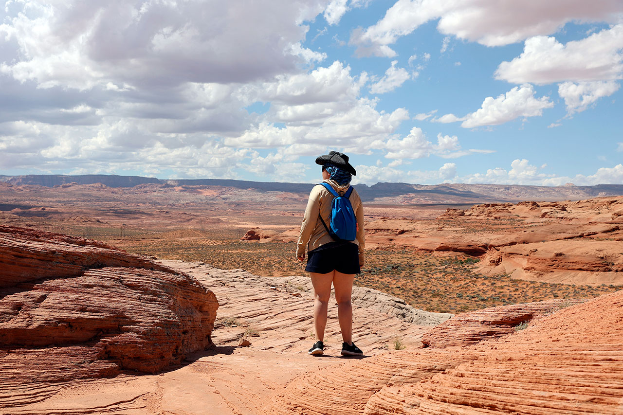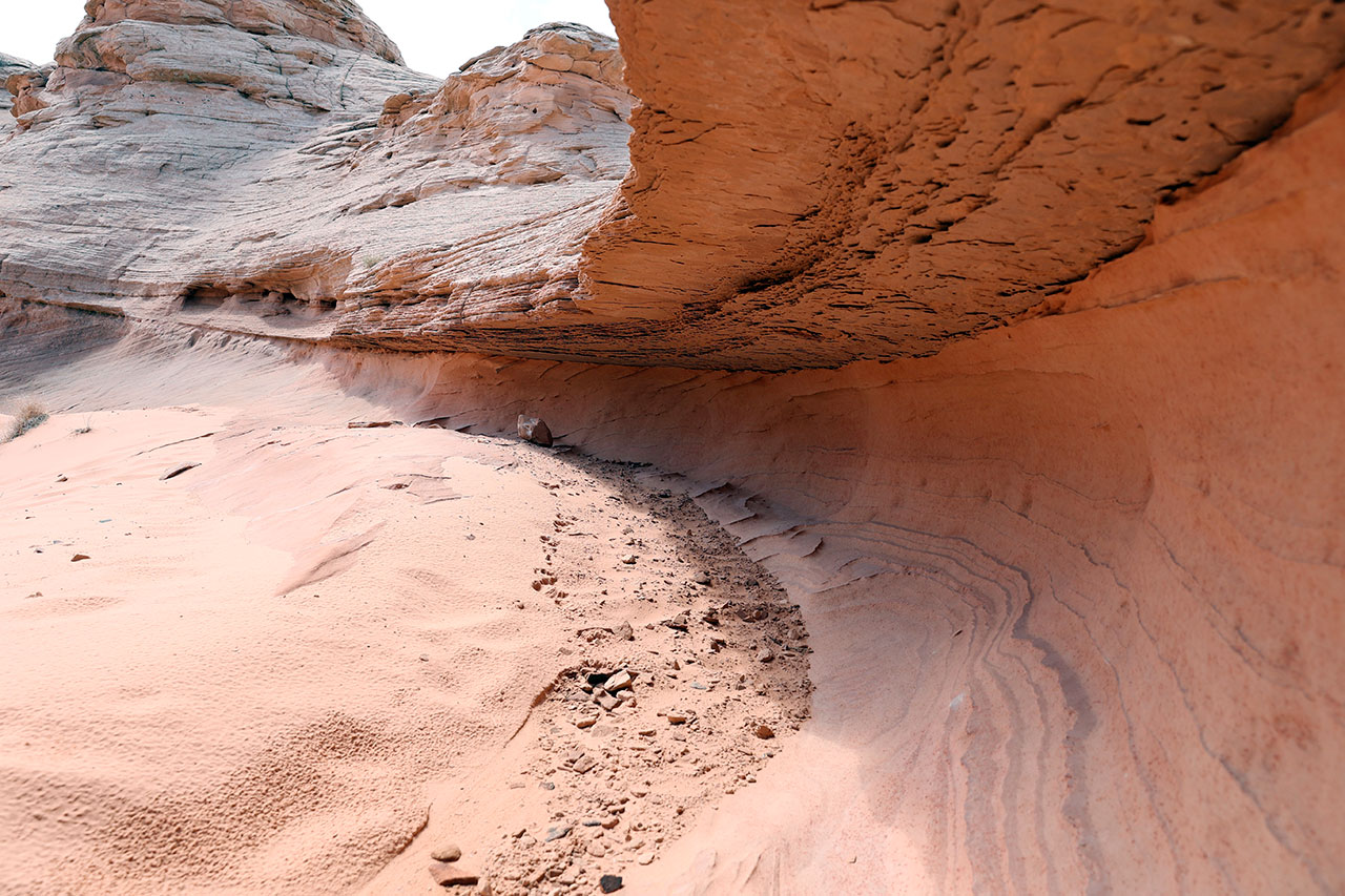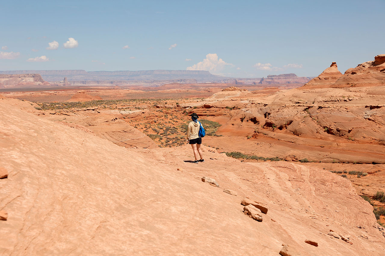 C’est littéralement à 500 mètres de la route et on y croise quasi personne. Sorti d’une influenceuse polonaise qui se filmait avec son drone et une dizaine de personnes, rien nada zéro. Pas un touriste à l’horizon. Et pourtant le panorama est fou. Le chemin est marqué au sol par des pierres qu’il suffit de suivre. Nous embarquons une bonne quantité d’eau, mettons nos protections anti UV (36° à ce moment de la journée) et partons voir si nous trouvons cette fameuse vague. Ayant un peu fait mes devoirs avant de partir, j’ai un plan des lieux et donc sait à peu près où chercher pour trouver le clou de la visite.