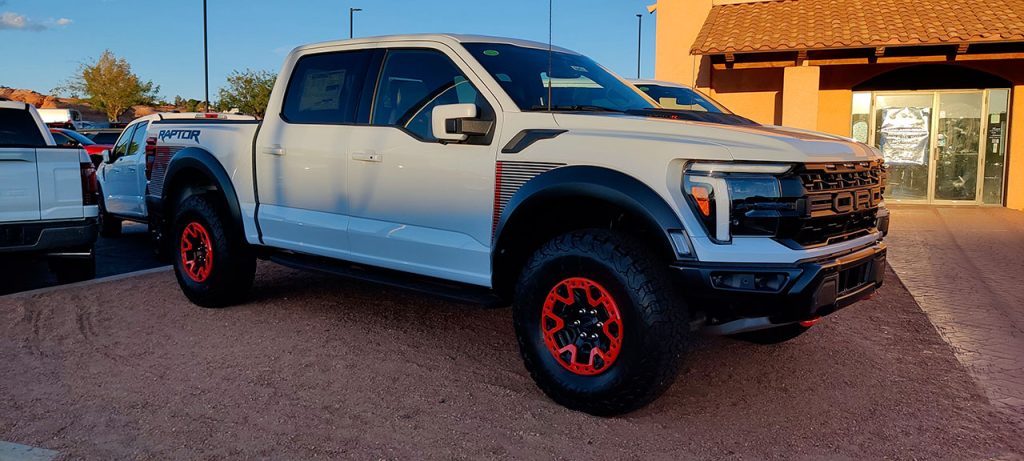 Ensuite rapide stop à l’hôtel pour poser nos affaires. L’hôtel se trouve sur Kaibab Street. Un nom qui ne s’invente pas. De l’autre côté de la rue, face à l’hôtel, se trouve une concession Ford avec toute une collection de pickups et surtout un F150 Raptor R. La version la plus énervée du F150 avec son « petit » V8 de 5,2L pour 725 chevaux. Celui garé devant la concession était affiché à 116880$ mais la liste d’options est plutôt conséquente. Donc si vous ne savez pas quoi m’offrir pour mon anniversaire… hein… voilà. Je l’aurais préféré en rouge mais ce gris craie me va très bien aussi.