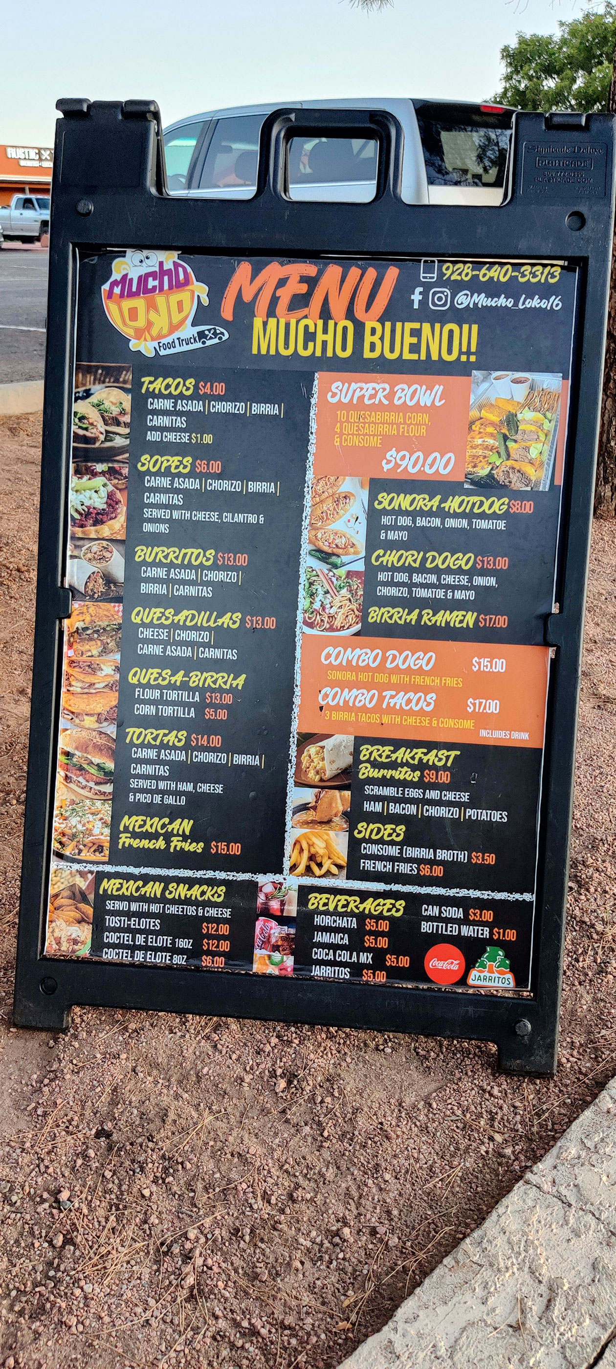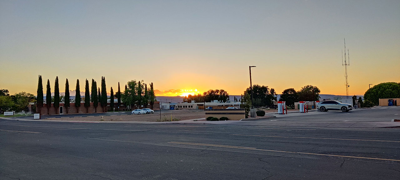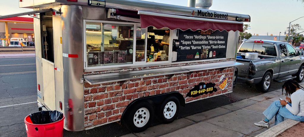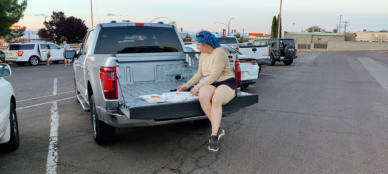 Retour à l’hôtel pour un apéro improvisé sur le parking puis vient le moment fatidique où il faut décider d’où nous allons aller dîner. Étant dans un endroit extrêmement touristique, Aurélie a décidé que nous n’irions pas dans un resto pour payer un plat les yeux de la tête. Avant de déclarer qu’elle avait envie de mexicain. OK ça me va. Comme par hasard, il y a un food truck mexicain face à la station service où nous avons fait le plein. Comme il est bien noté, nous irons là. Tacos et sopes pour elle, tortas pour moi. Je n’ai aucune idée de ce que c’est comme plat mais je tente. Puis soudain je demande à Aurélie où nous allons manger. Retour à l’hôtel pour un repas de la tristesse dans notre chambre de Motel 6 (équivalent Première Classe chez nous)? Non. ce sera littéralement au cul du camion, dans la benne du pick-up sur le parking où est stationné le food truck. Il fait encore 31° mais on est bien, notre petite installation est parfaite et c’est probablement le meilleur mexicain que j’ai mangé de ma vie. Bien entendu, qui dit mexicain dit piment. Aurélie, aimant les cascades avec tout ce qui est épicé, croque dans le piment. Je vois encore les regrets au fond de ses yeux.