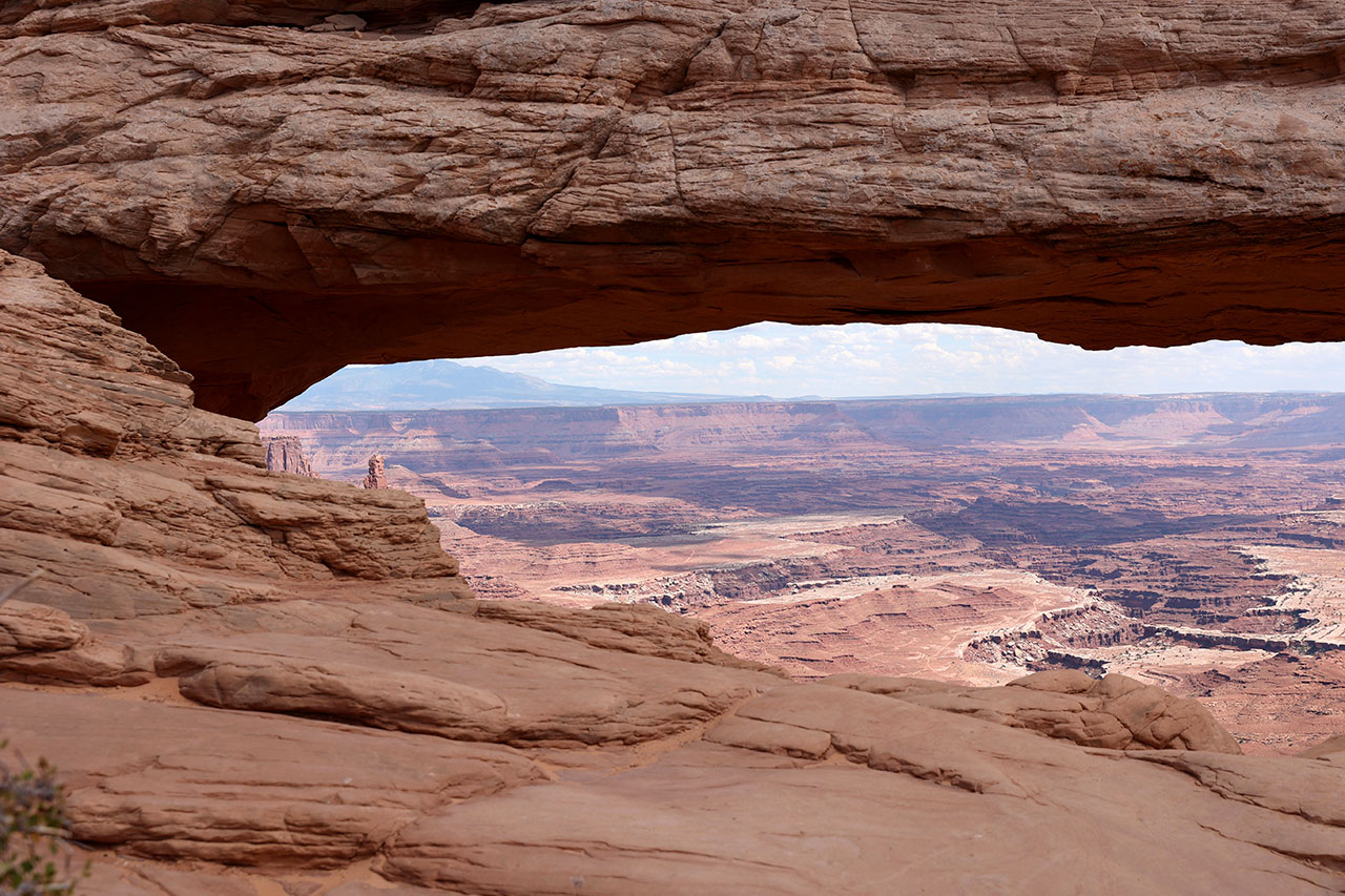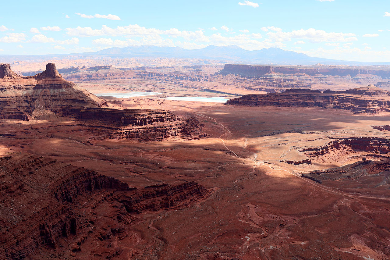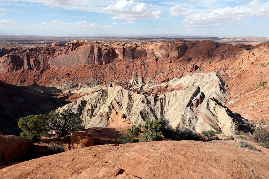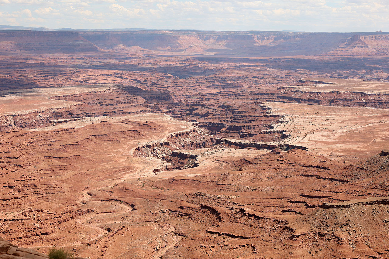 Aujourd’hui nous partons explorer la partie nord de Canyonlands National Park. Nord parce qu’au nord du Colorado qui coule en son milieu. Colorado que nous avons déjà croiser 2 fois lors de ce voyage, au barrage Hoover et au barrage de Glen Canyon. Pourquoi la partie nord? Parce que c’est plus spectaculaire et aussi la plus facile d’accès. La partie sud est plus pour les baroudeurs habitués au hors piste. Et aussi parce que ce parc est tellement gigantesque que pour couvrir les 2 parties il faut bien 4 jours. Nous nous faisions d’ailleurs la réflexion que pour couvrir Arches National Park et Canyonlands National Park en quasi intégralité, une semaine n’est pas de trop.