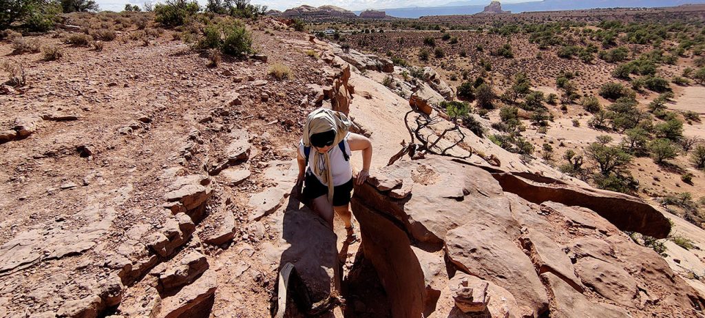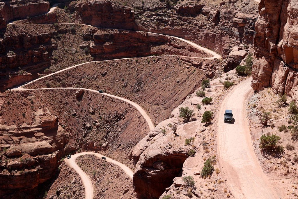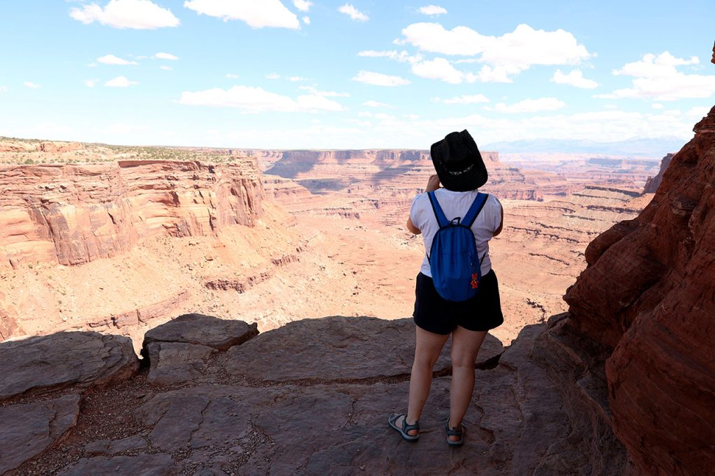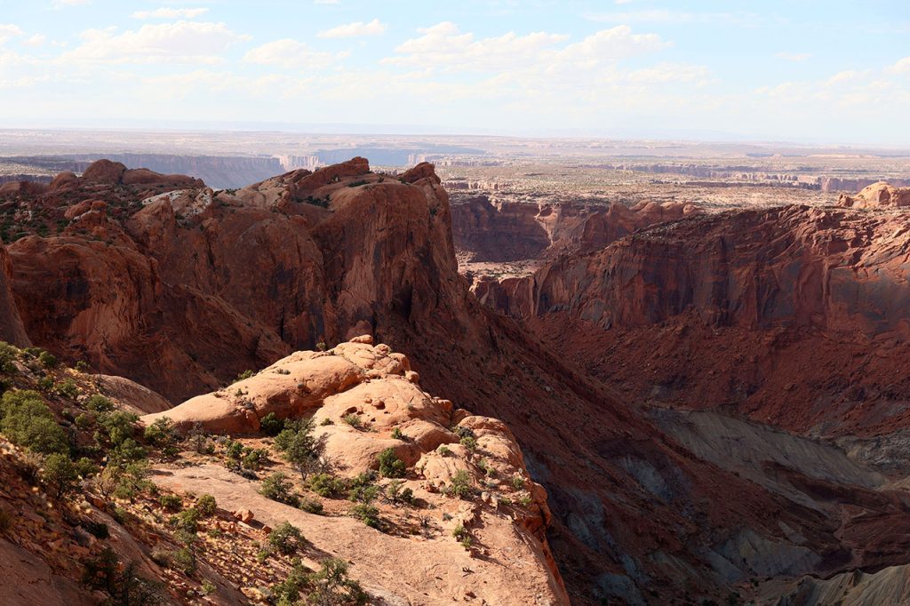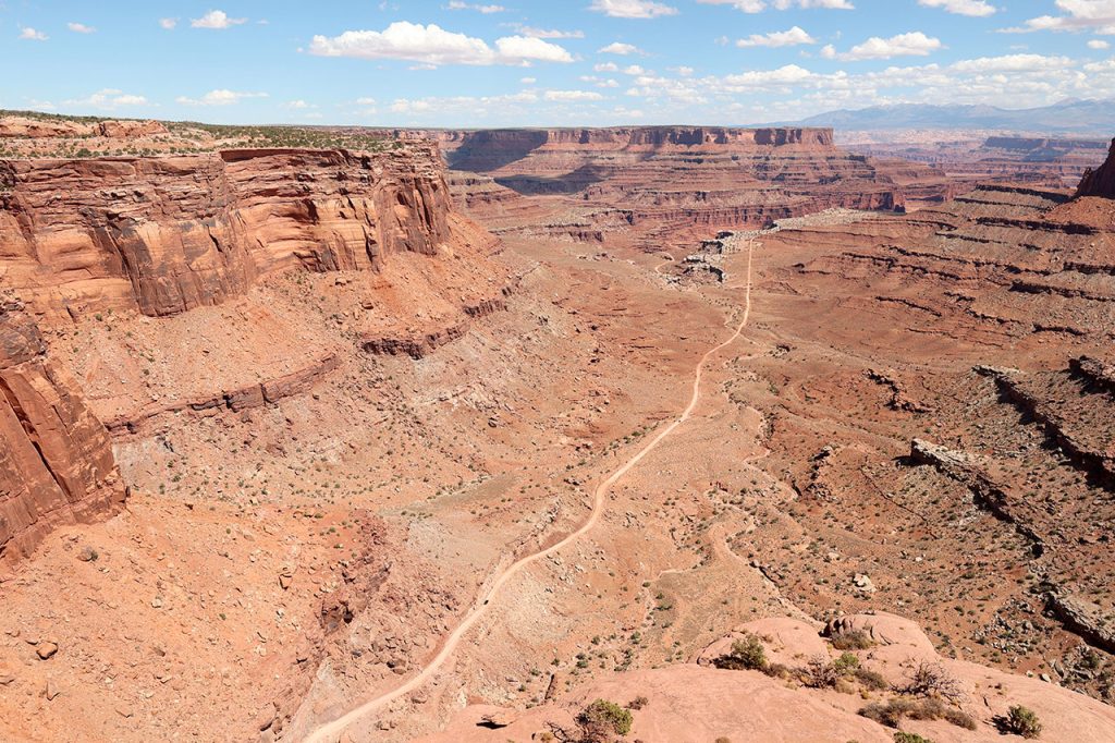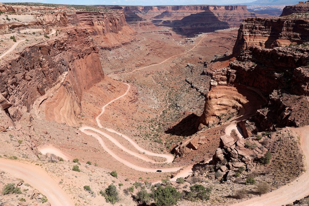 Le problème avec Canyonlands, c’est que c’est un immense cul de sac. Il n’y a en effet aucune route qui passe par dessus les canyons. Donc il faut revenir en arrière pour sortir et / ou aller à un autre endroit du parc. J’avais donc imaginé que nous ferions la partie haute (sur le plateau) le matin puis que nous enchaînerions sur la partie basse (en bord de fleuve) l’après-midi. Puis en fouinant sur Instagram (oui encore), j’ai découvert qu’il existait un chemin permettant de faire une boucle au lieu de devoir faire un détour de plusieurs dizaines de kilomètres. Sauf que cette route est en fait un chemin de terre, certes avec un panorama a coupé le souffle mais surtout avec une descente au-delà de 10%. Donc quand nous entrons dans le parc, arrêt au visitor center pour aller demander aux rangers si c’est faisable avec une voiture 2 roues motrices. Réponse « oui mais nous le déconseillons. Vous allez constamment freiner. Si vous bloquez les roues vous êtes dans le ravin. »