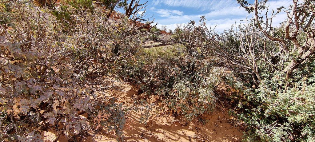Comme l’extrémité sud du parc est fermée pour travaux, nous improvisons une rando de milieu d’après-midi autour d’un lieu nommé Aztec Butte. Nous embarquons toute notre eau et partons vers la fameuse butte. Nous arrivons au pied et avons comme un gros doute sur le chemin à suivre. Faut-il monter la roche ou bien la contourner? Le plan n’est pas clair sur le sujet. Nous décidons de la contourner. Et nous voila en train de errer dans un désert d’arbustes, cactus et autres buissons piquant par 35° à chercher un chemin qui n’existe pas. Nous cherchons des traces pour nous repérer mais il n’y a rien. Même pas une balise. Au bout de 45 minutes, nous décidons de faire demi-tour et de repasser sur nos traces pour retrouver notre chemin. Visiblement nous avons loupé un truc.